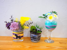 色とりどりの砂を重ね合わせたアートに観葉植物かメモクリップをお選びいただきお作りいただきます。